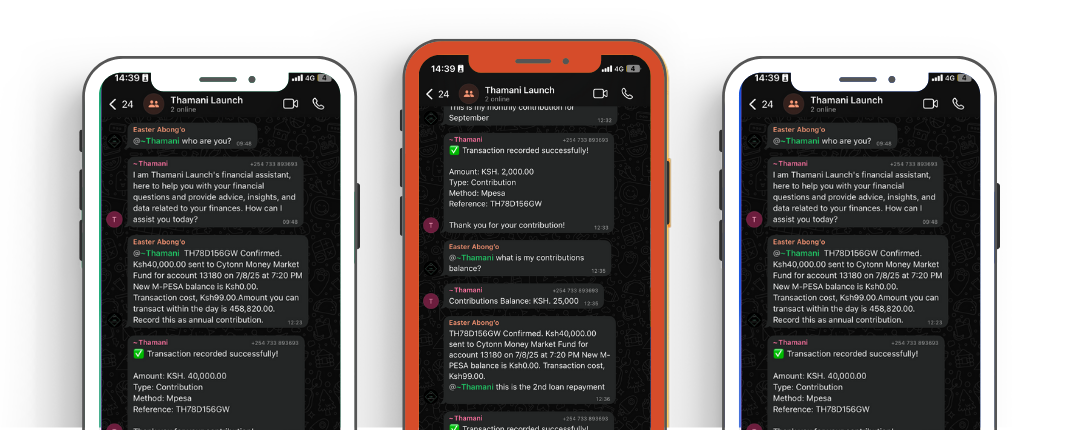 Thamani applies your rules, sends smart reminders, tracks contributions, fines, and loans — and generates instant balances and reports anytime via chat or the admin dashboard.